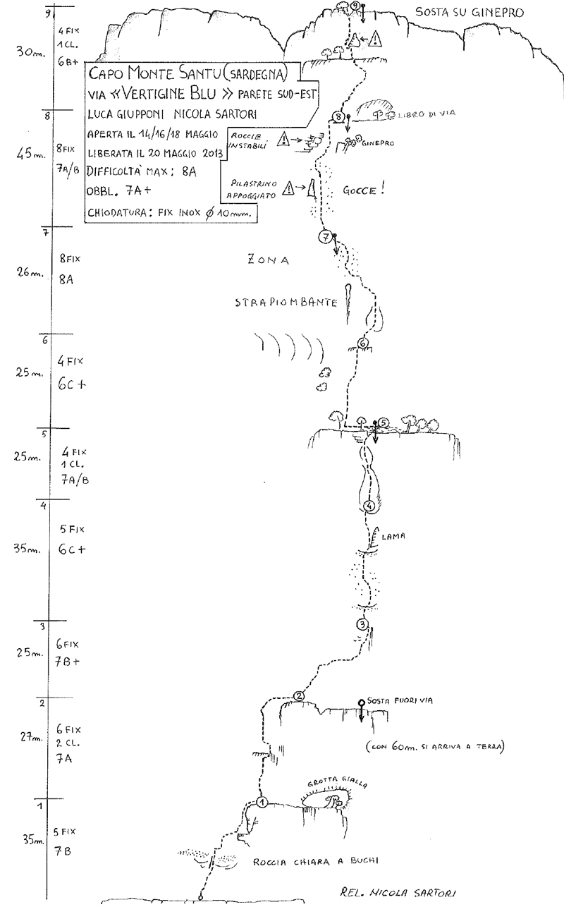 Due nuove vie di 8a sul Monte Santu, Baunei, Sardegna, una delle ultime pareti vergini della Sardegna: "Vertigine Blu" (275m, 8a max, 7a+ obbl.) aperta da Luca Giupponi e Nicola Sartori e "Blu Oltremare" (315m, 8a max, 7b obbl.) aperta da Rolando Larcher e Maurizio Oviglia. Entrambe sono state salite dal basso il 14/16 e 18 maggio 2013 per poi essere salite Rotpuntk il 20/05/2013.
